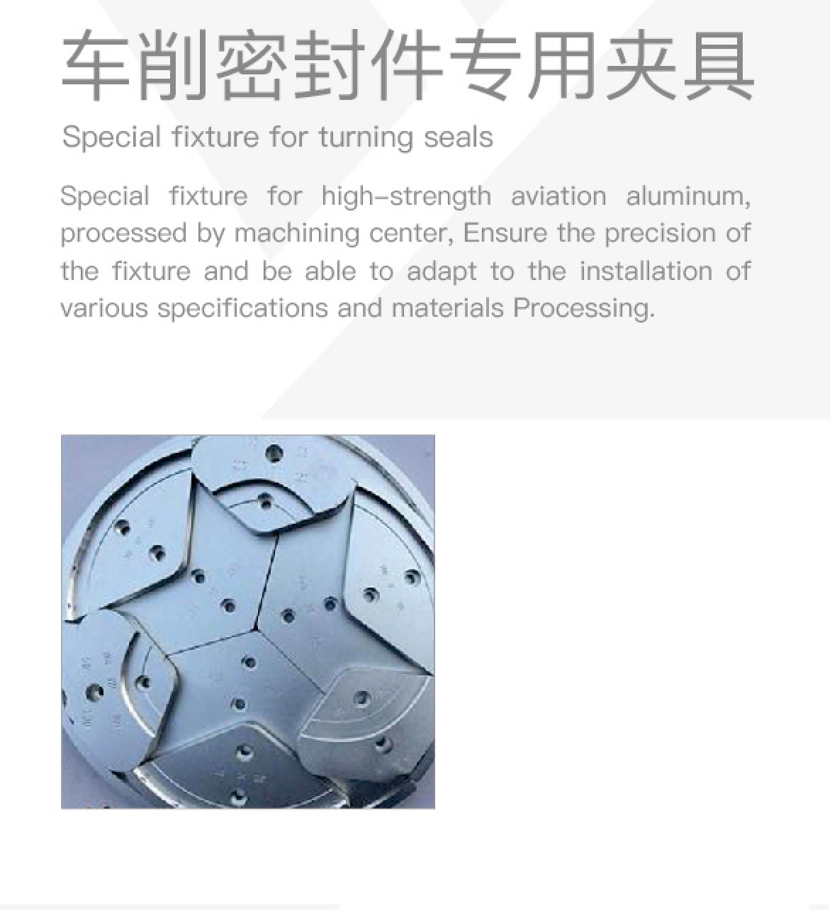 Special fixture for turning seals Special fixture for high-strength aviation aluminum,processed by machining center, Ensure the precision of the fixture and be able to adapt to the istallation of various specications and materials Processing.